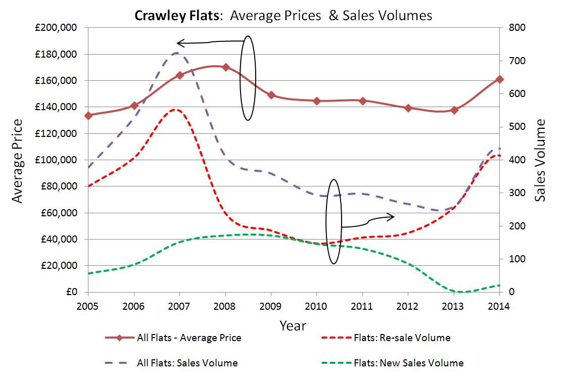 The net result of the oversupply of new-build flats to the Crawley market during the credit crunch, has resulted in lower capital growth for flats compared with houses.